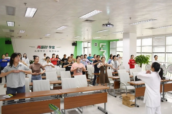 “最后,我們來練一套養(yǎng)生操,大家平時(shí)也可以把它當(dāng)做工間操……”伴著舒緩的“八段錦”音樂,40多名女職工跟著老師行云流水、張弛有度、形神兼?zhèn)涞刈銎鹆恕鞍硕五\工間操”。此時(shí),柳州市中醫(yī)院腫瘤科一病區(qū)負(fù)責(zé)人、醫(yī)學(xué)博士斯韜《談?wù)劧际信缘摹拔床∠确馈迸c“已病防變”》的講座接近了尾聲。“兩手托天理三焦”“左右開弓似射雕”“調(diào)理脾胃須單舉”……女職工們將斯韜博士在此之前的講課內(nèi)容,即中醫(yī)養(yǎng)生智慧、現(xiàn)代女性特點(diǎn)及疾病預(yù)防“落實(shí)”到自己的一伸手、一抬腿中,切實(shí)感受到結(jié)合了傳統(tǒng)功法的中醫(yī)養(yǎng)生所具有的獨(dú)特效果,讓身心都得到了放松。